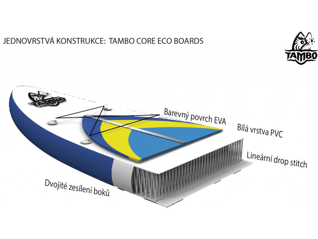 Konštrukcia paddleboardu je z kvalitného jednovrstvého ECO materiálu dropstitch. Tvar paddleboardu je navrhnutý tak, aby mal dostatočnú smerovú stabilitu na stojatej vode, avšak aby bol stále obratný a stabilný.